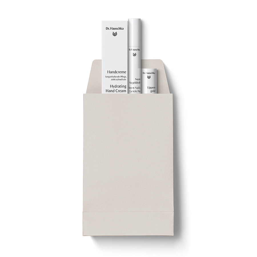 1. Крем для рук Dr. Hauschka, 20 мл.:Вода, этанол, растительный глицерин, экстракт корня алтея и язвенника целебного, миндальное масло, жирные спирты, пчелиный воск, экстракт цветков тёрна, арахисовое масло, масло жожоба, масло зародышей пшеницы, бентонит, экстракты каланхоэ и моркови, смесь натуральных эфирных масел, лактоза, лизолецитин, ксантан.2. Гигиеническая помада Dr. Hauschka, 4,9 г.:Масло клещевины, экстракт плодов шиповника, масло жожоба, ланолин, пчелиный воск, экстракт моркови, масло ши, канделилльский воск, карнаубский воск, экстракт розовых лепестков, миндальное масло, экстракт язвенника целебного, жирные спирты, масло ядер абрикоса, воск жожоба, смесь натуральных эфирных масел, воск розы, лецитин.3. Масло для ногтей с ниимом в карандаше Dr. Hauschka, 3 мл.: Арахисовое масло, экстракты листьев ниима и язвенника целебного, масло ядер абрикоса, экстракт ромашки, смесь натуральных эфирных масел.